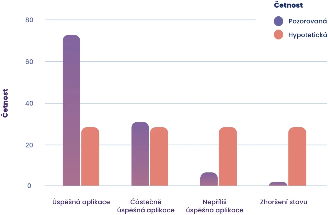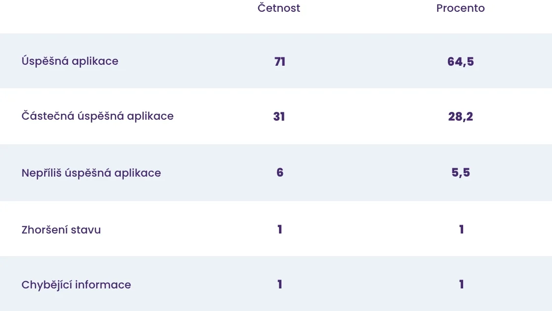 - Aplikace byla lékaři hodnocena jako zcela úspěšná u 64,5 % pacientů a přibližně 28,2 % pacientů bylo hodnoceno jako částečně úspěšně vyléčených.